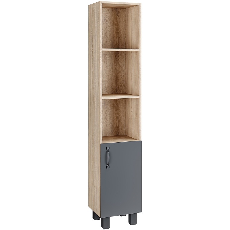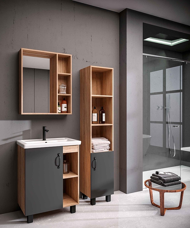 Открытые полки обеспечивают быстрый доступ к аксессуарам, а пространство за распашной дверцей, снабженной системой плавного закрывания, станет удобным местом для хранения бытовых принадлежностей.