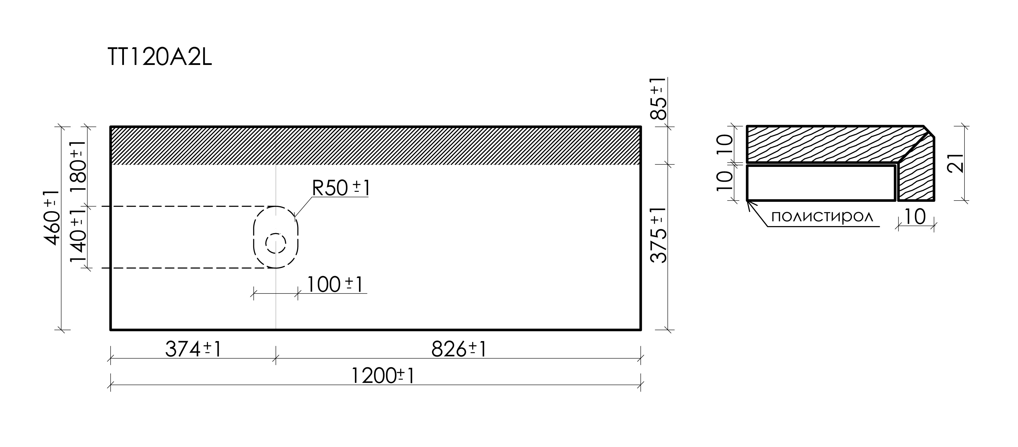 Столешница выполнена из натурального керамогранита по двухслойной технологии.
