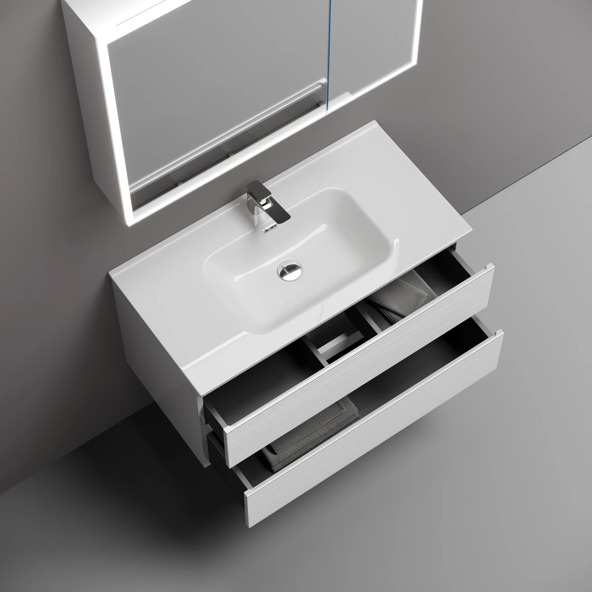 - Тумба подвесная с двумя выдвижными ящиками с доводчиками скрытого монтажаКаркас и фасад тумбы выполнен из МДФ, покрытие ПВХ - пленка.
