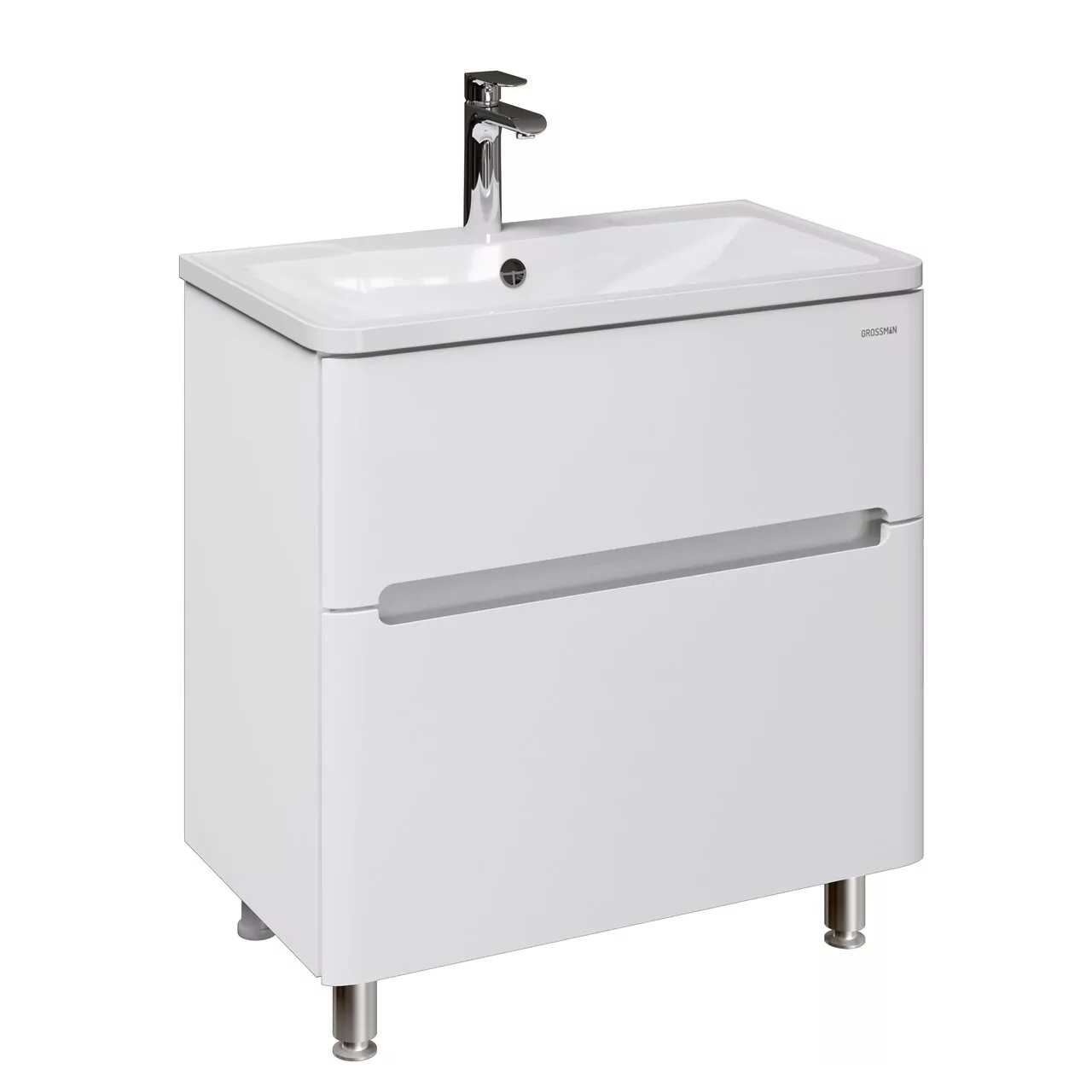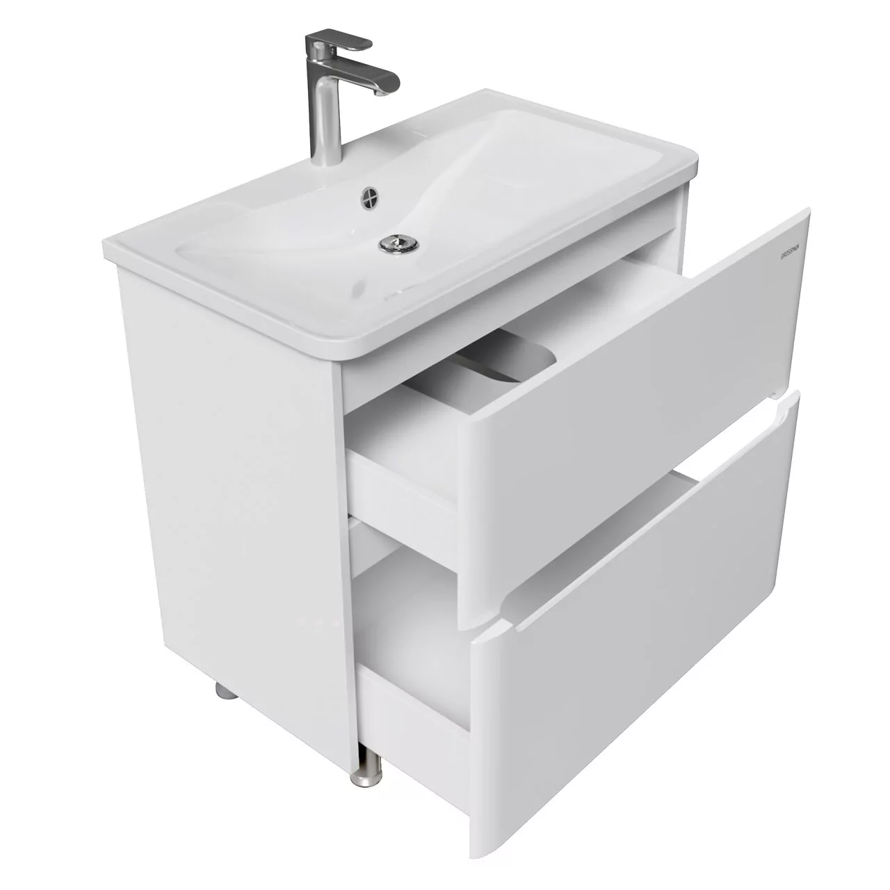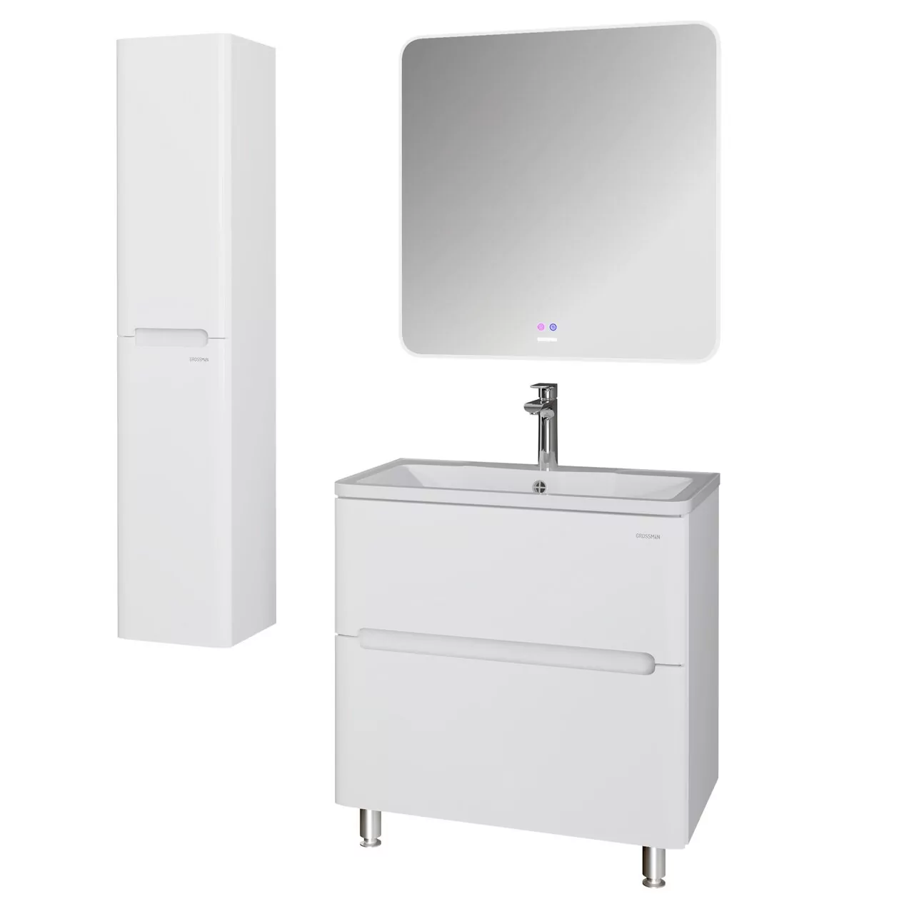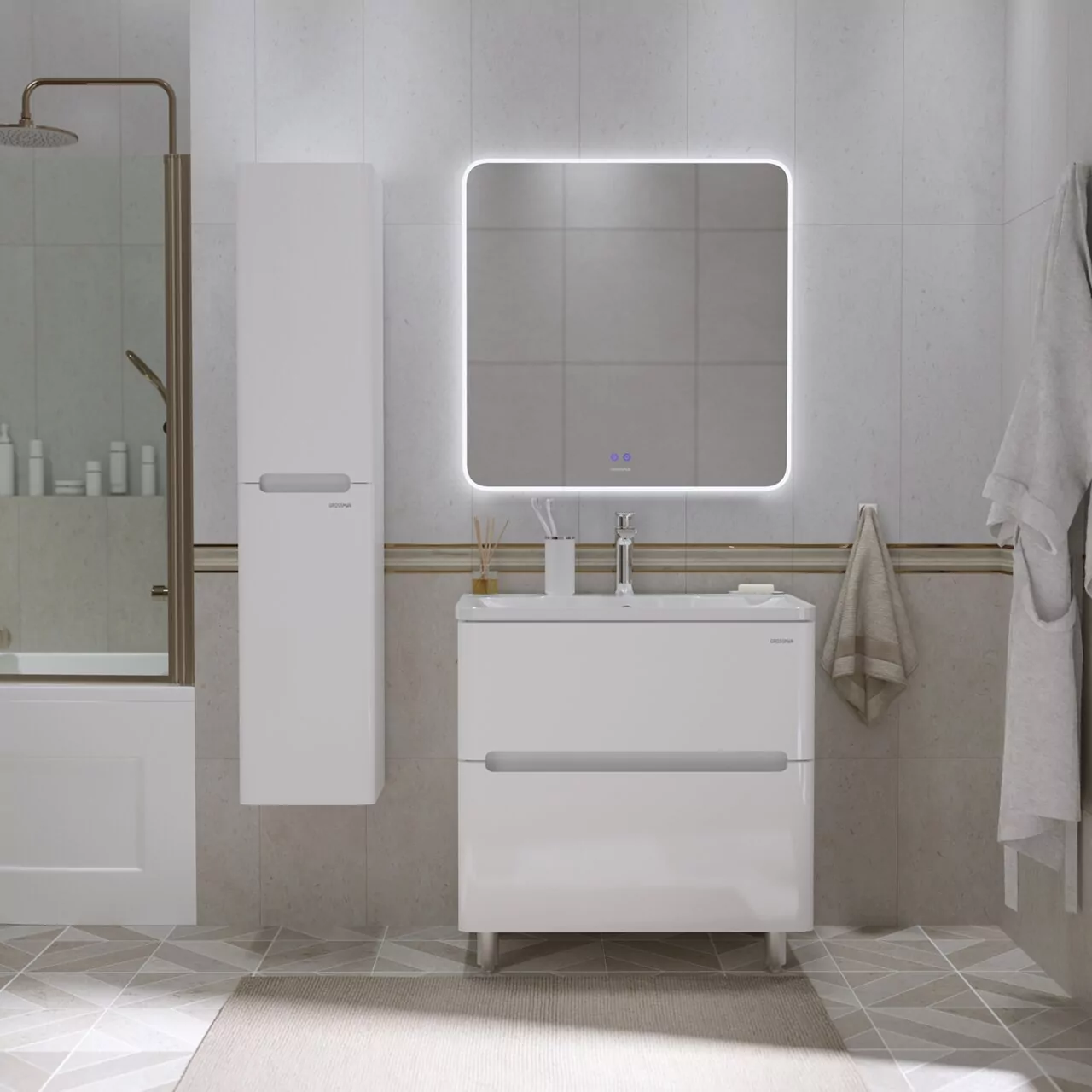 Тумба выполнена из влагостойкого МДФ покрытая белой глянцевой краской, устойчивая к перепадам температур и высокой влажности, крепится к стене.