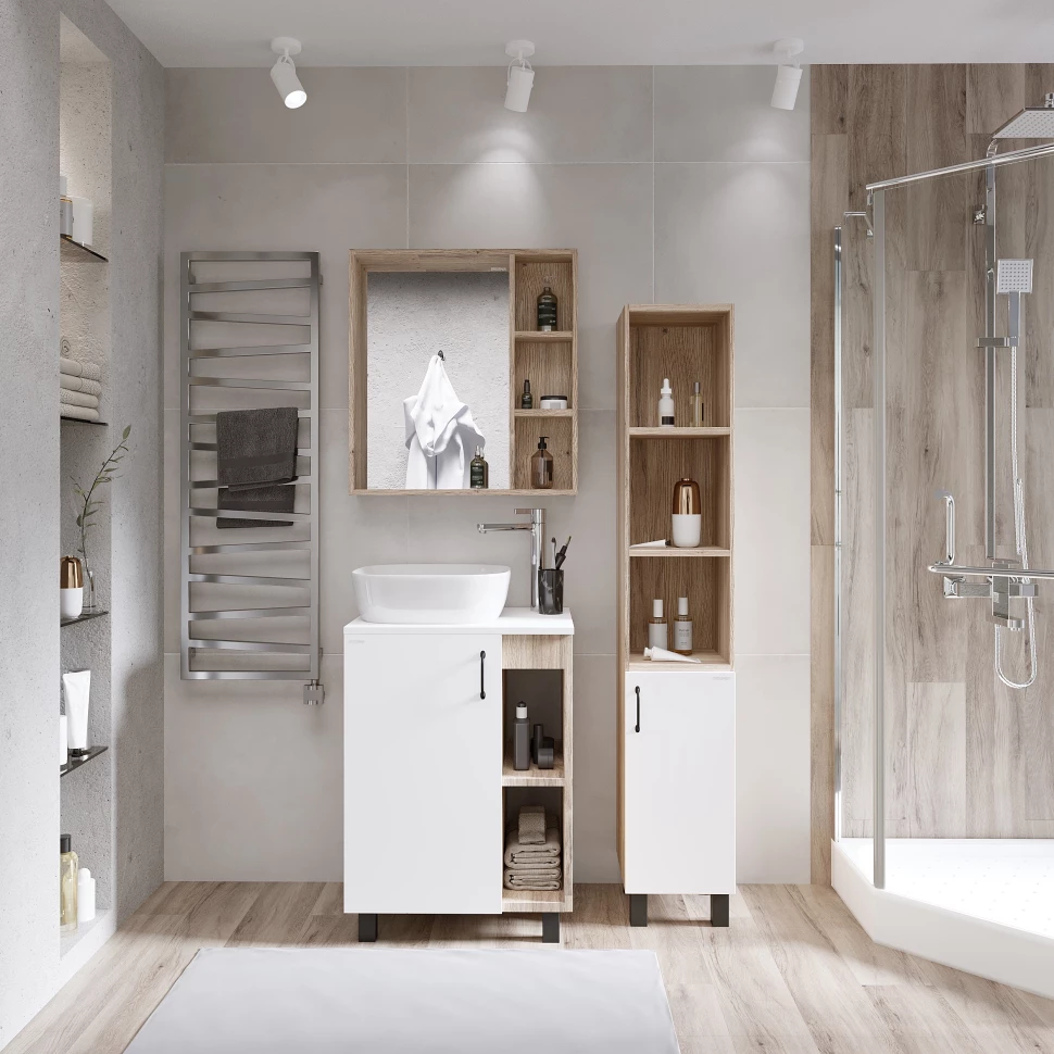 Открытые полки справа обеспечивают быстрый доступ к аксессуарам, а пространство за распашной дверцей, снабженной системой плавного закрывания, станет удобным местом для хранения бытовых принадлежностей.