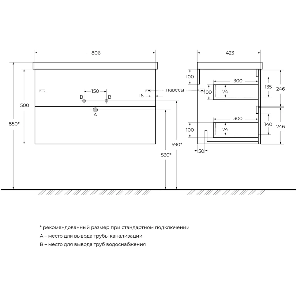 - Размеры корпуса тумбы (ШхВхГ): 806х800х423 мм.