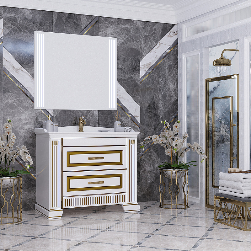 Мебель для ванной комнаты из коллекции ОНИКС комплектуется раковиной из литого мрамора и оригинальным зеркалом со встроенной подсветкой и сенсорным выключателем.