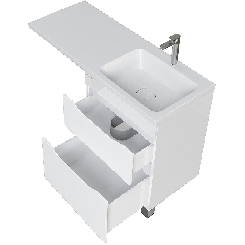 Изготовлена тумба из влагостойкого МДФ, покрытого белой глянцевой краской, устойчивой к перепадам температур и высокой влажности, что делает его идеальным для использования в ванной комнате.