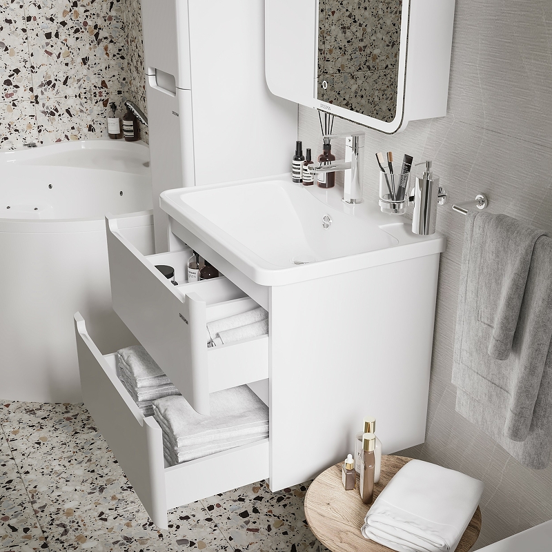 Тумба снабжена двумя ящиками, которые укомплектованы направляющими плавного закрывания, ящики предназначены для хранения различных предметов.