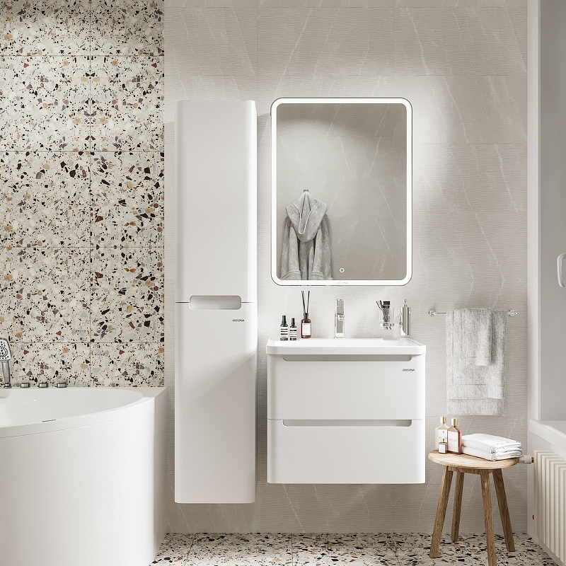 Тумба выполнена из влагостойкого МДФ покрытая белой глянцевой краской, устойчивая к перепадам температур и высокой влажности, крепится к стене и занимает мало места.