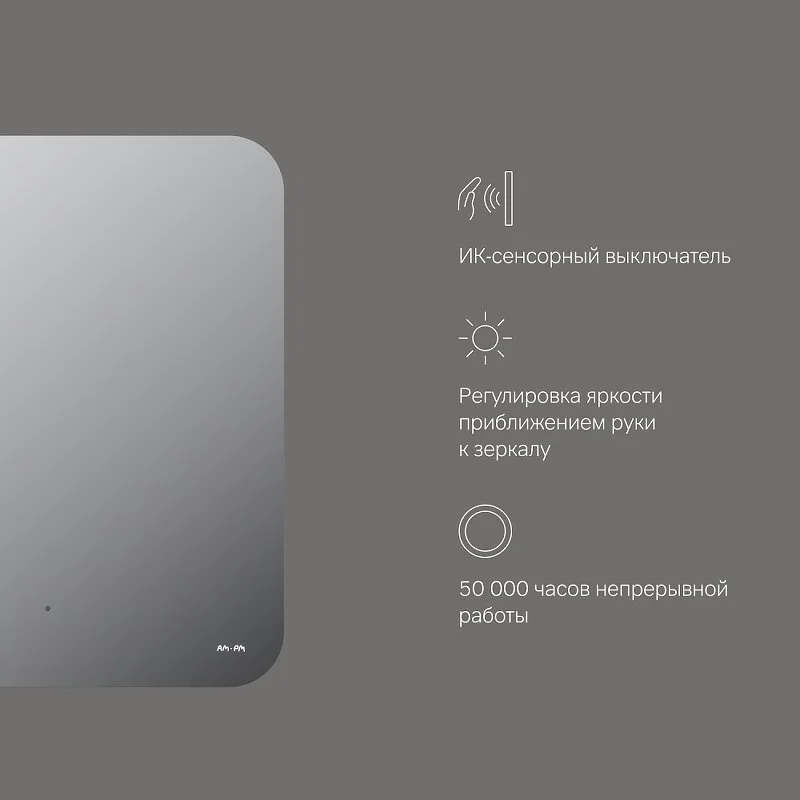 - Бесконтактный сенсорный выключатель Touchless – никаких отпечатков на зеркальном полотне! Свет включается легким взмахом руки. Функция диммирования позволяет регулировать яркость жестом. Гарантия 3 года.