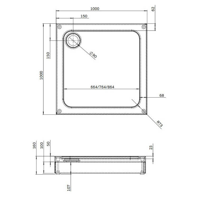 - Совместим с квадратными душевыми уголками размером 100х100, дверьми в нишу 100 cм.