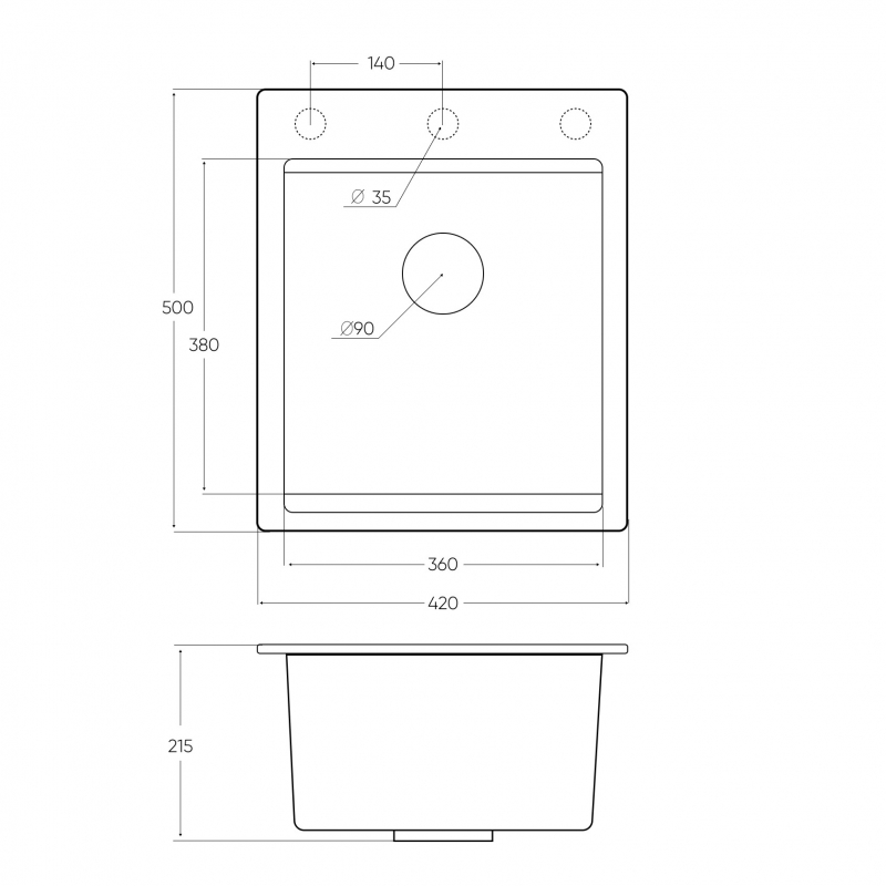 Размеры мойки: 420 x 500 мм Размеры чаши: 360 x 380 х 215 мм Монтажная тумба от 450 мм Способ монтажа: врезной Размер сливного отверстия: 90 мм Размер упаковки: 540 х 540 х260 мм Вес брутто: 12 кг Гарантия на мойку 5 лет.