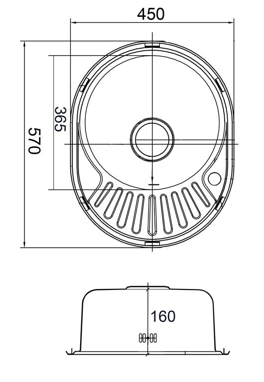 Размеры мойки: 570 х 450 мм Размеры чаши: d370 х 180 мм Толщина стали: 0,6 мм Монтажная тумба от 600 мм Способ монтажа: врезной Размер сливного отверстия: 90 мм Размер упаковки: 610 х 480 х 220мм Вес брутто: 2.83 кг Гарантия на мойку 5 лет.