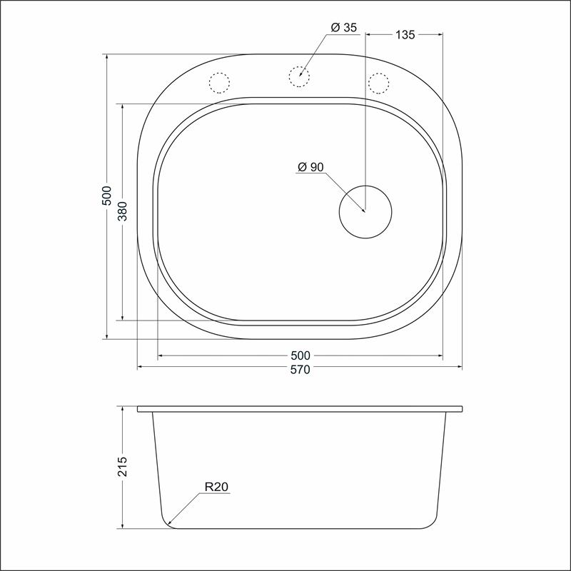 Размер мойки: 570 x 500 мм Размеры чаши: 500 x 380 х 215 мм Монтажная тумба от 600 мм Способ монтажа: врезной Размер сливного отверстия: 90 мм Размер упаковки: 560 х 720 х 280мм Вес брутто 13,5 кг Гарантия на мойку - 5 лет.