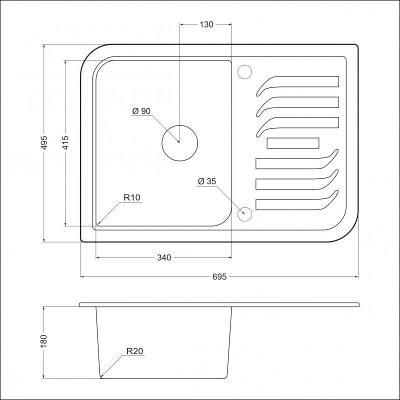 Размеры мойки: 695 x 495 мм Размеры чаши: 340 x 415 х 180 мм Монтажная тумба от 600 мм Способ монтажа: врезной Размер сливного отверстия: 90 мм Размер упаковки: 900 х 540 х230мм Вес брутто: 15.30 кг Гарантия на мойку 5 лет.