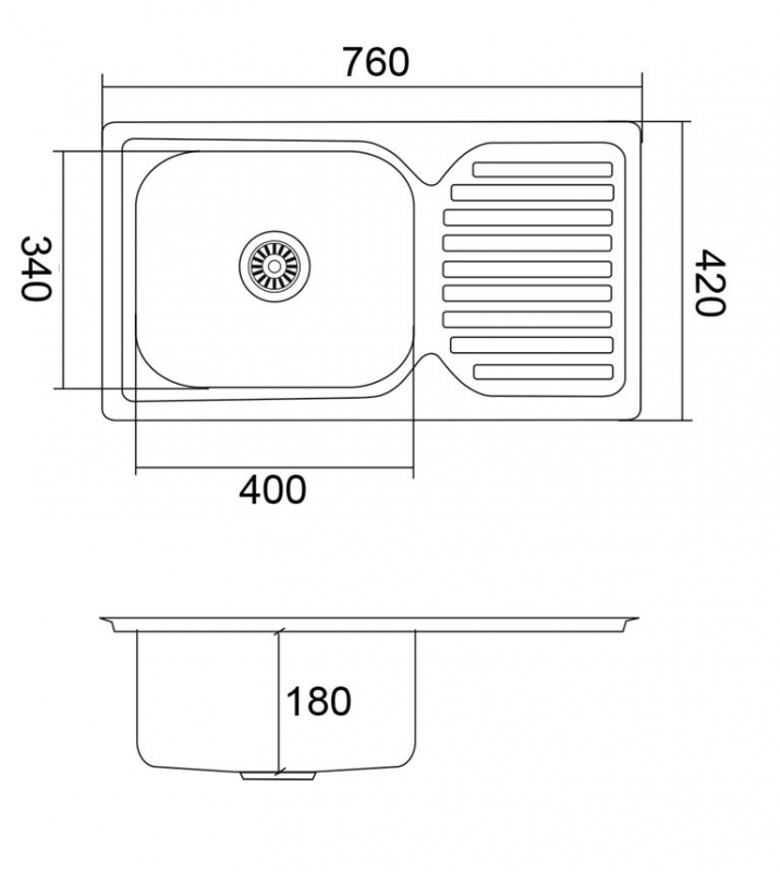 Размеры мойки: 760 х 420 мм Размеры чаши: 400 х 340 х 180 мм Толщина стали: 0,8 мм Монтажная тумба от 800 мм Способ монтажа: врезной Размер сливного отверстия: 90 мм Размер упаковки: 800 х 380 х 220мм Вес брутто: 4.04 кг Гарантия на мойку 5 лет.