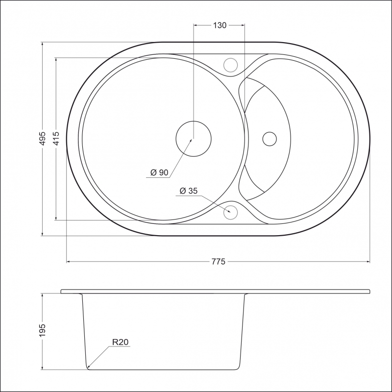Размеры мойки: 775 x 495 мм Размеры чаши: d415 х 195 мм Монтажная тумба от 800 мм Способ монтажа: врезной Размер сливного отверстия: 90 мм Размер упаковки: 900 х 540 х230 мм Вес брутто: 14.50 кг