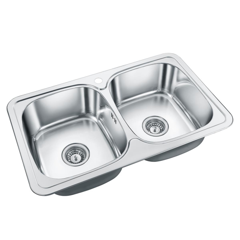 Классическая двухчашевая мойка из нержавеющей стали AISI 201 с глянцевой поверхностью. На дне установлена резиновая шумопоглощающая накладка.