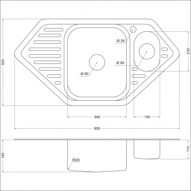 Трапециевидная мойка с двумя чашами из нержавеющей стали AISI 201 с глянцевой поверхностью. Данная модель предназначена для монтажа в угол. На дне установлена резиновая шумопоглощающая накладка.