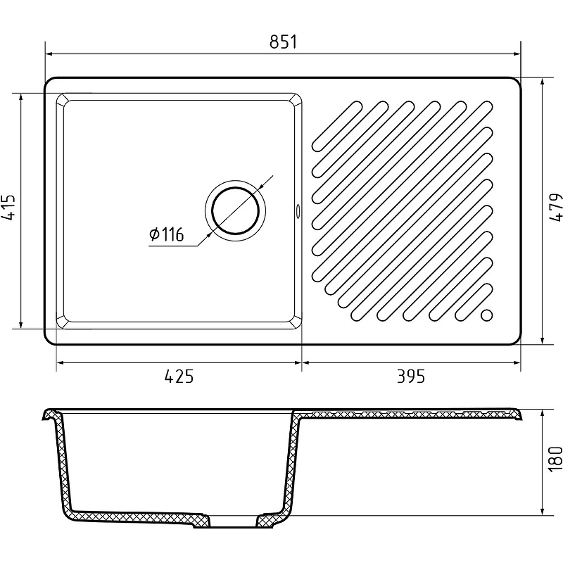 Материал обладает высокой термоустойчивостью, что позволяет использовать мойку при высоких перепадах температур, а гладкая поверхность мойки позволит легко удалить любые загрязнения с поверхности мойки.