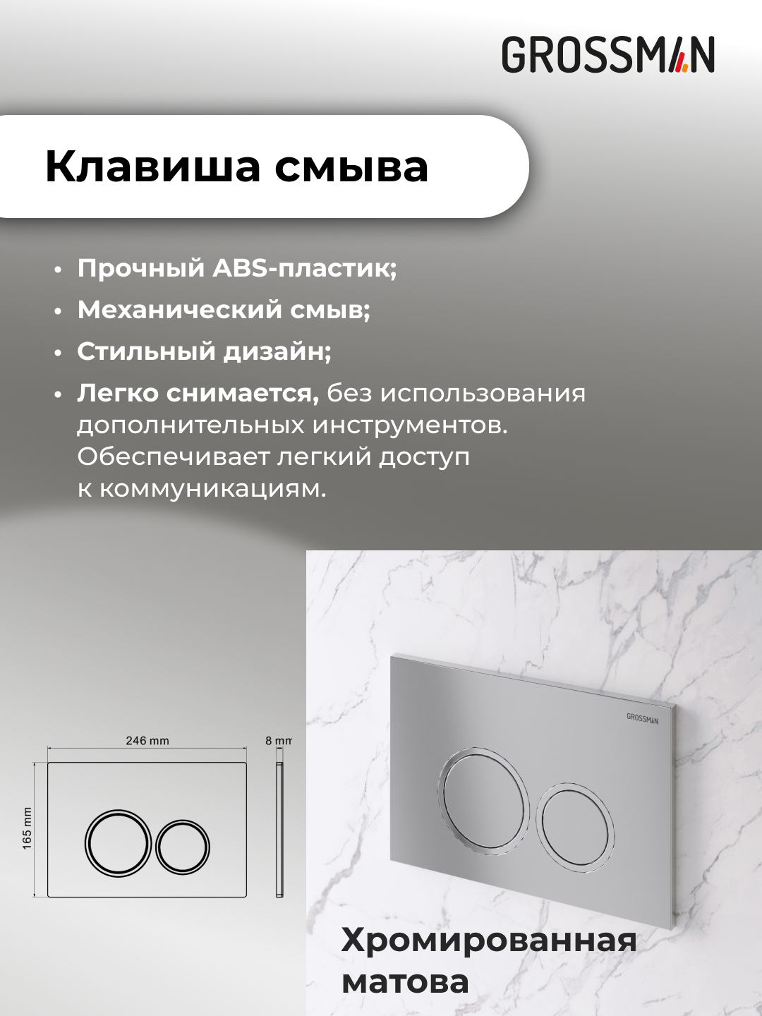 Инсталляция Grossman Galaxy 97.01.110 предназначена для монтажа в стену и на пол. Это обеспечивает дополнительную устойчивость и надежность конструкции.