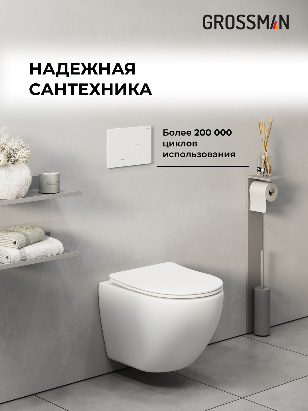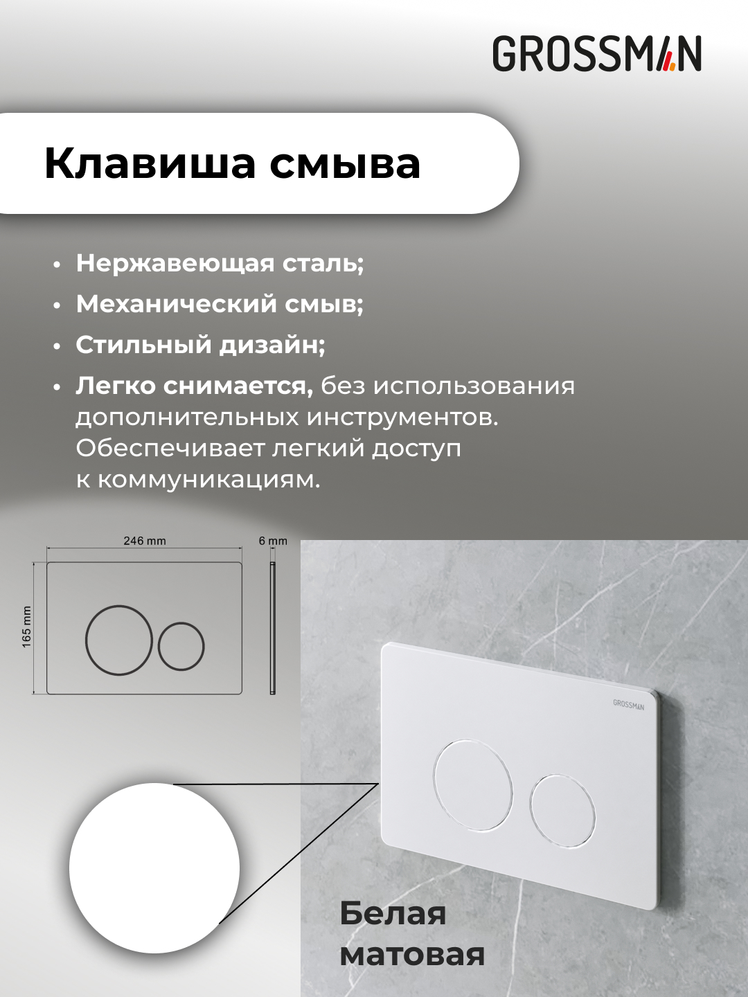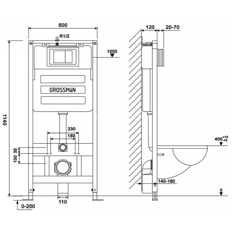 Инсталляция Grossman Style 97.05.01M предназначена для монтажа в стену и на пол, что обеспечивает надежность и устойчивость конструкции.