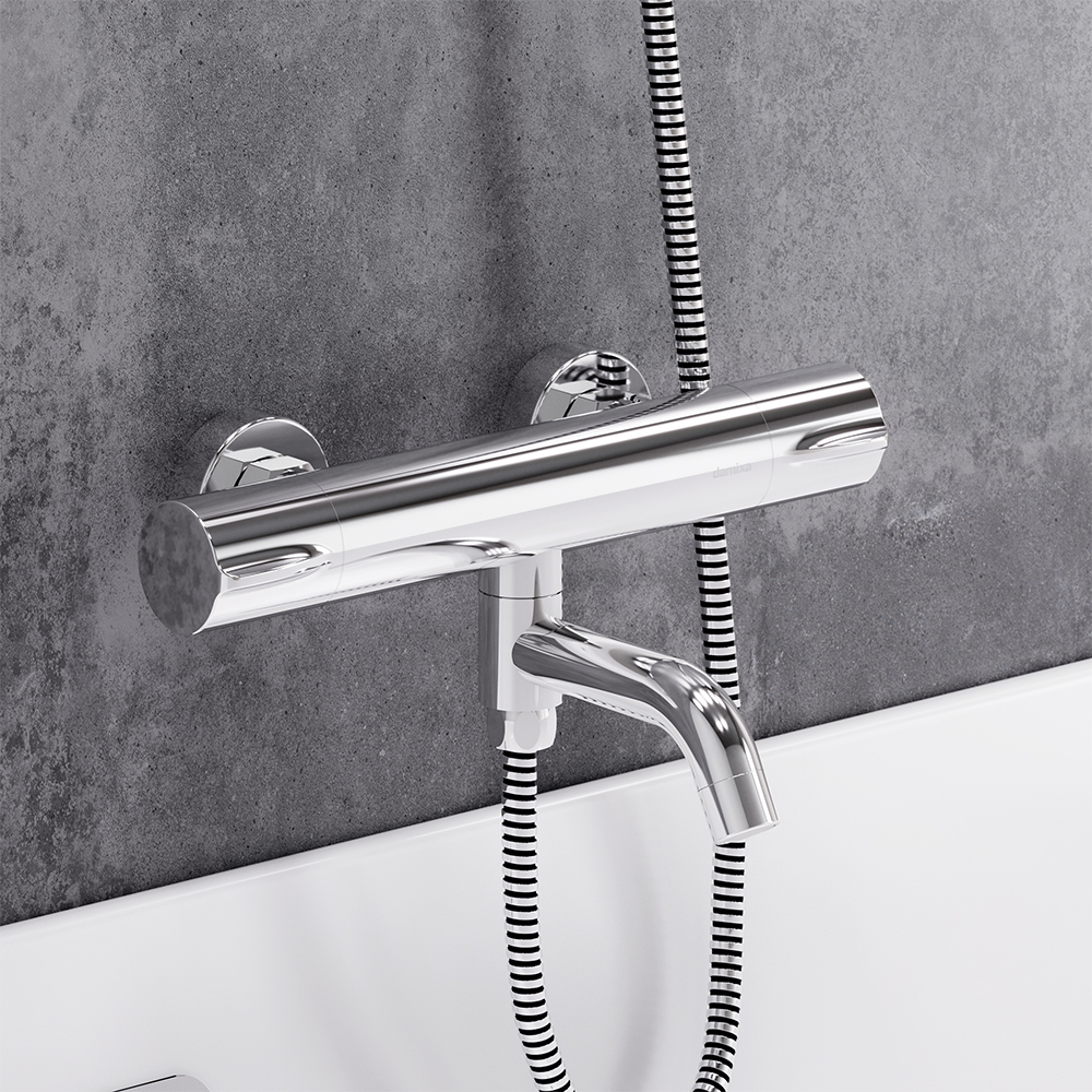 Максимальная безопасность: термостатический картридж 35мм обеспечивает точную настройку температуры и напора воды. Специальная кнопка-предохранитель не позволяет случайно повысить температуру воды. Выставляйте комфортные для вас параметры легким поворотом правой ручки смесителя. Переключайте потоки воды между лейкой и изливом - поворотом излива.