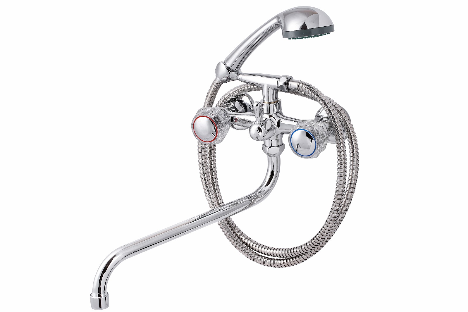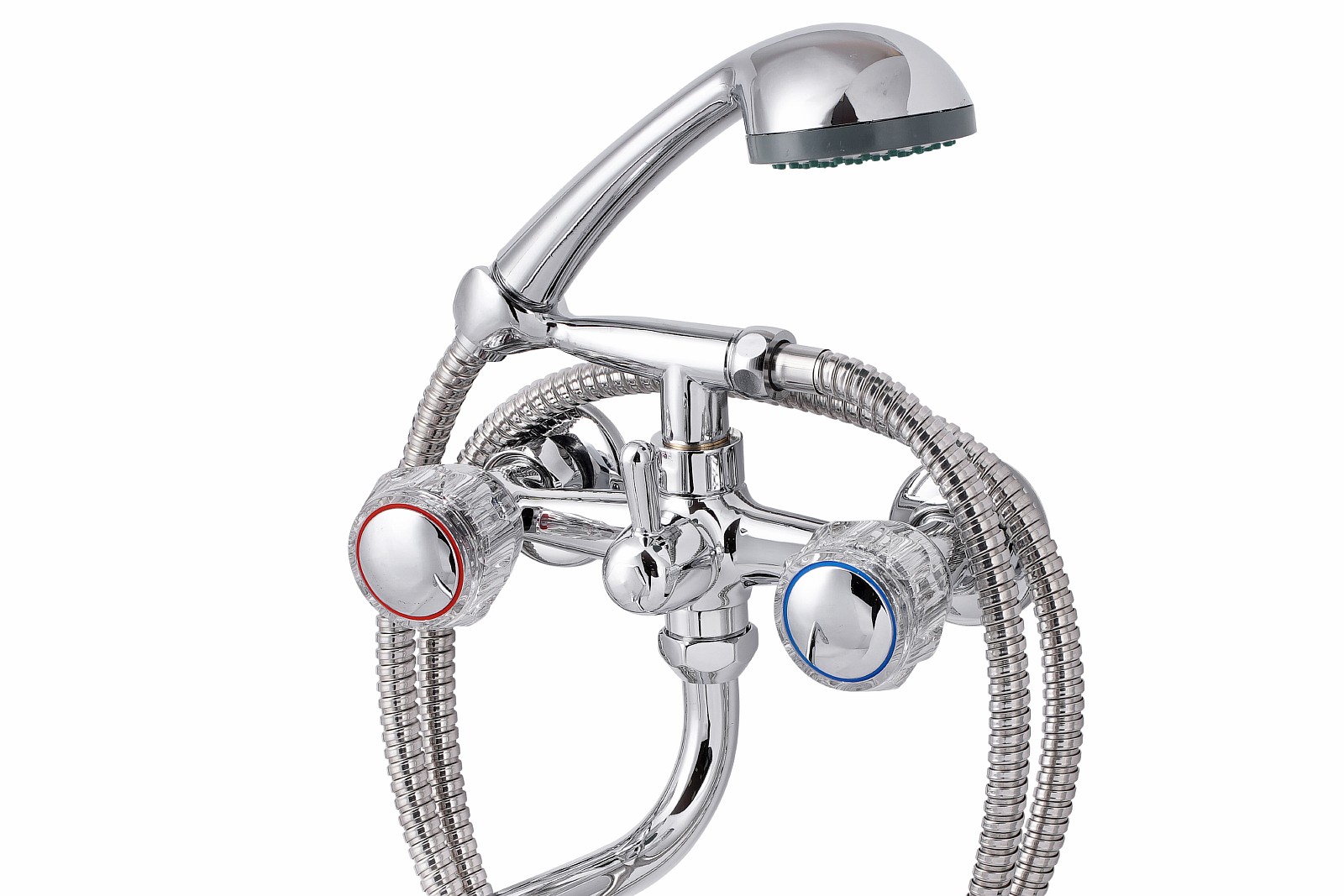 Смеситель, эксцентрики-2шт., декоративная шайба (отражатель)-2шт., шланг душевой, лейка душевая, держатель душевой лейки, паспорт.