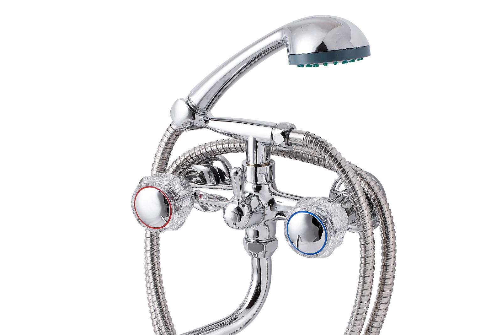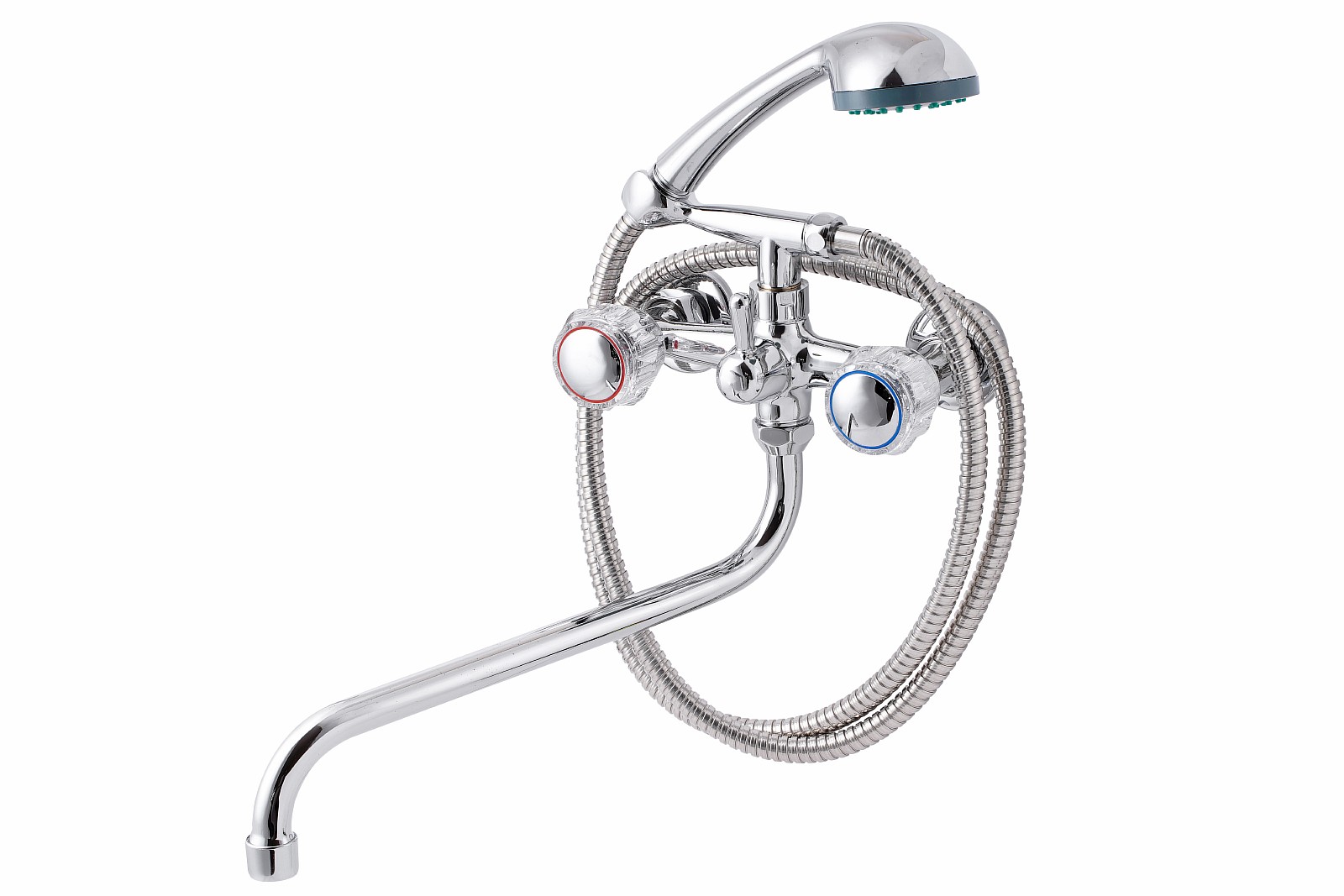 Смеситель, эксцентрики-2шт., декоративная шайба (отражатель)-2шт., шланг душевой, лейка душевая, держатель душевой лейки, паспорт.