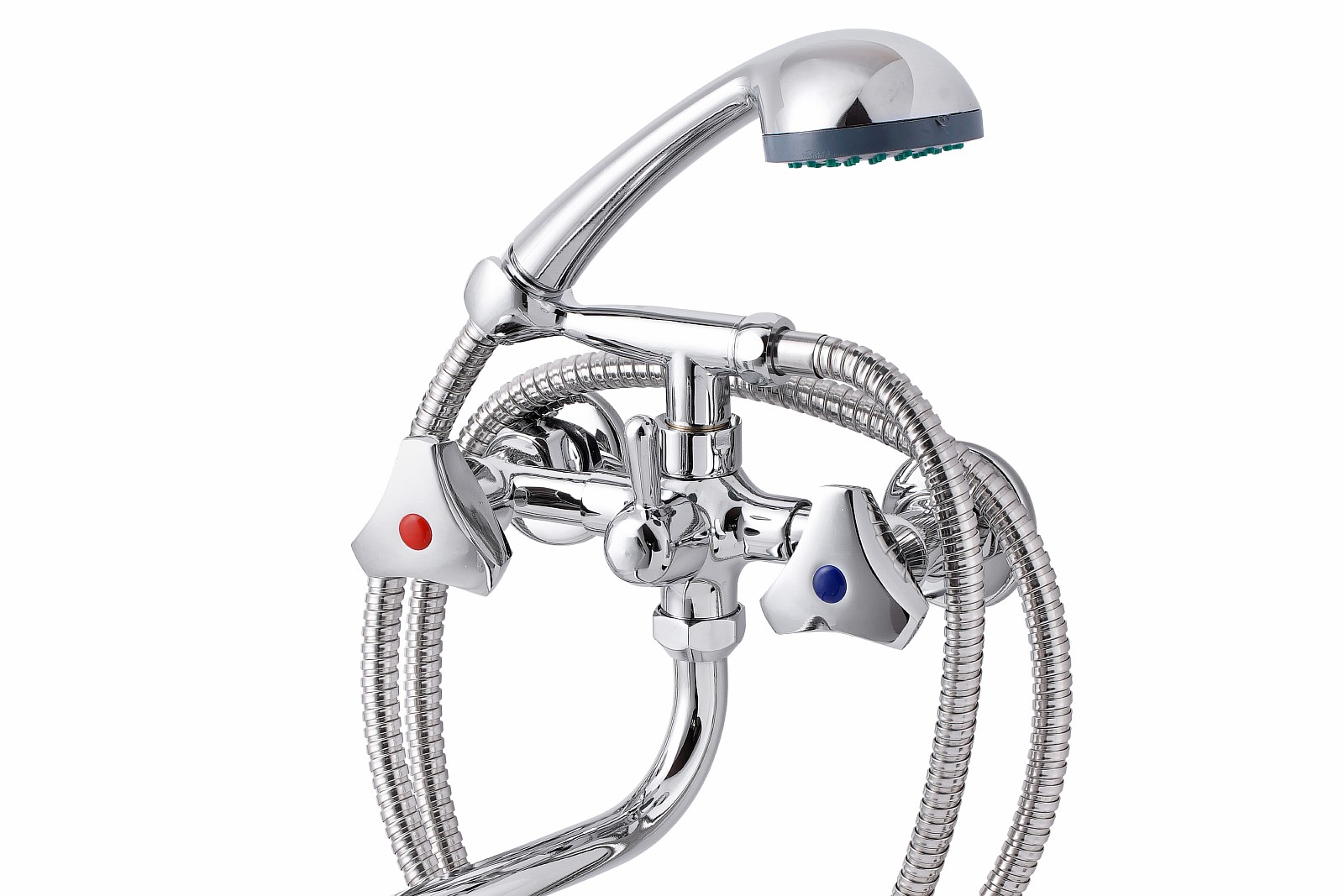 Смеситель, эксцентрики-2шт., декоративная шайба (отражатель)-2шт., шланг душевой, лейка душевая, держатель душевой лейки, паспорт.