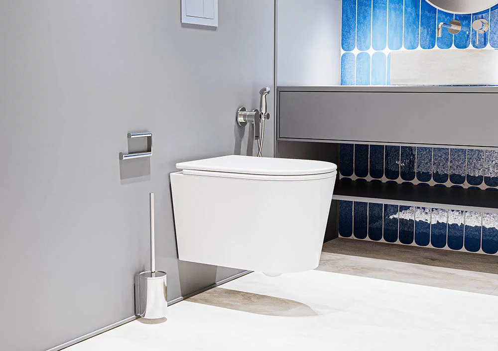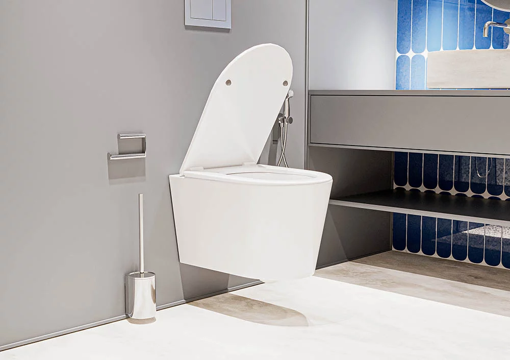 - Форма воронки унитаза предотвращает образование брызг