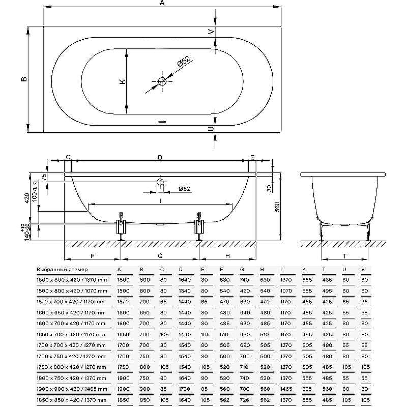 - Размер чаши ванны (ШхВхД): 750х420х1700 мм.