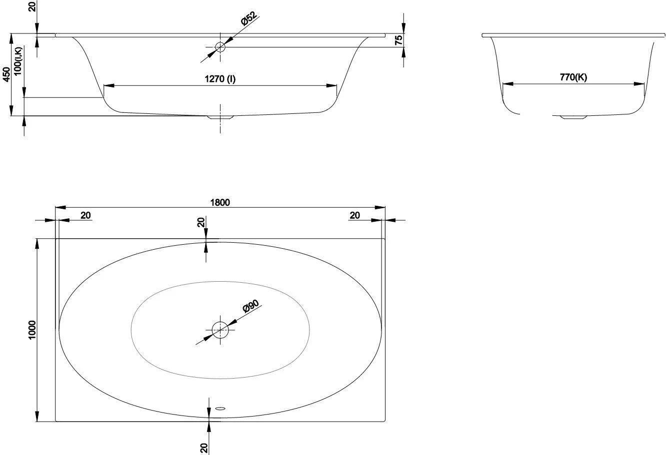 - Размер чаши ванны (ШхВхД): 1000х450х1800 мм.