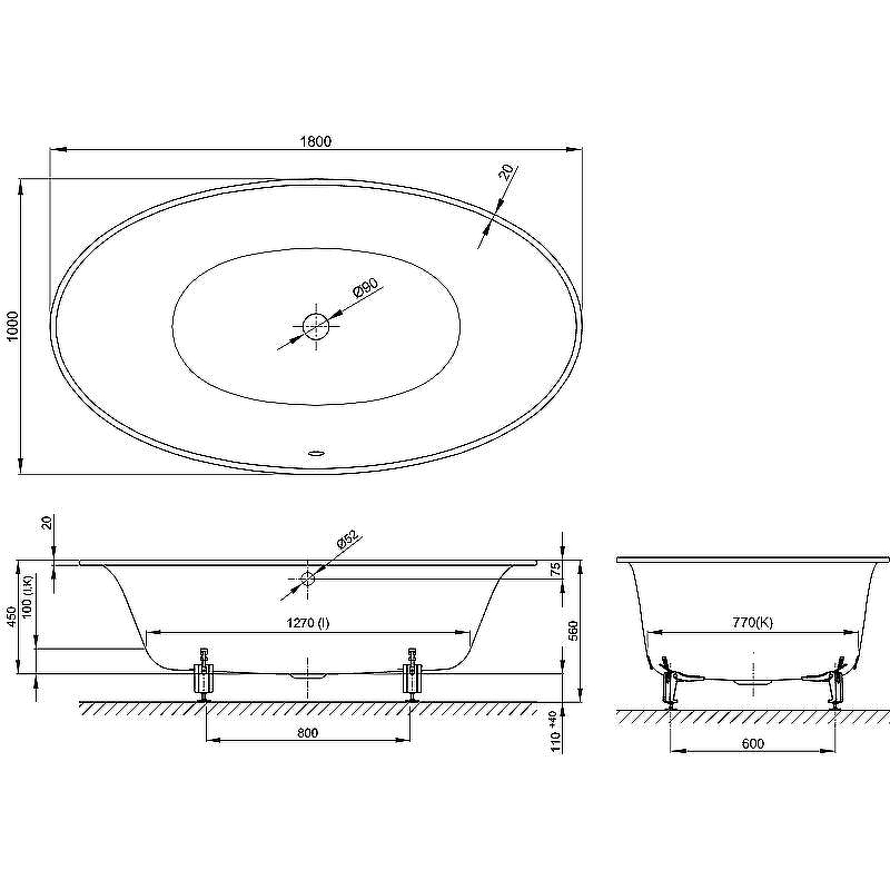 - Размер чаши ванны (ШхВхД): 1000х450х1800 мм.