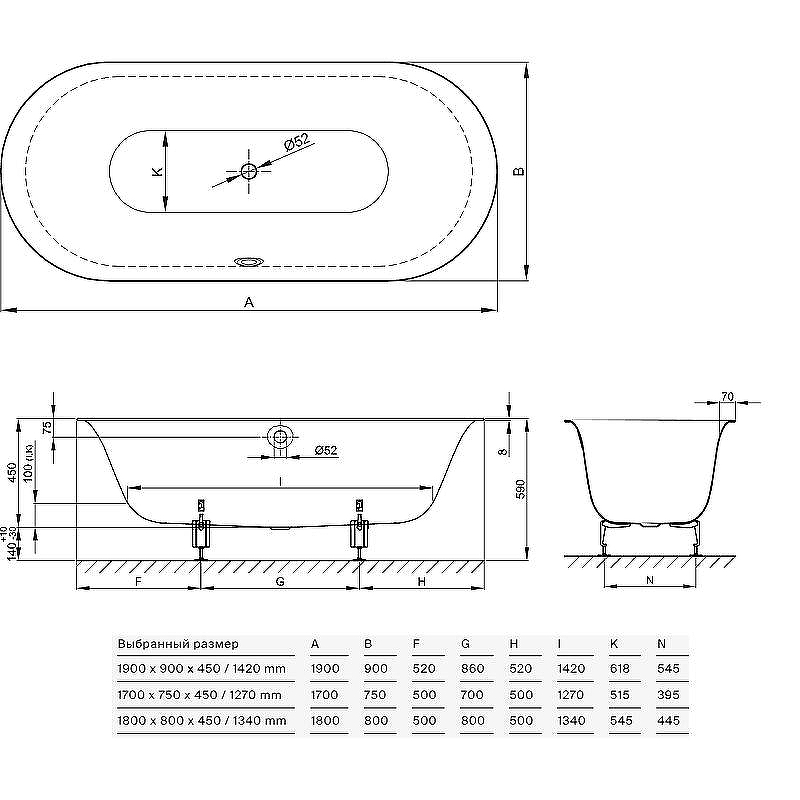 - Размер чаши ванны (ШхВхД): 900х450х1900 мм.