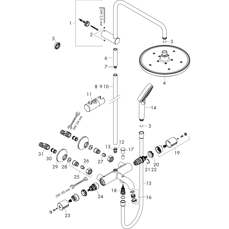 - Состоит из: верхний душ, ручной душ, термостат для ванны, штанга для душа, держатель для душа.