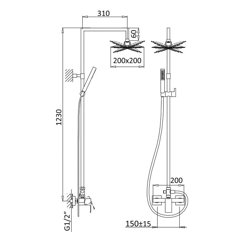 - Оснащение: душевая лейка, шланг для душа, держатель душа, дивертор, смеситель,верхний душ