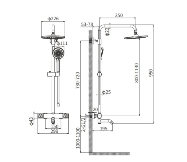 - Диаметр верхнего душа: 226 мм