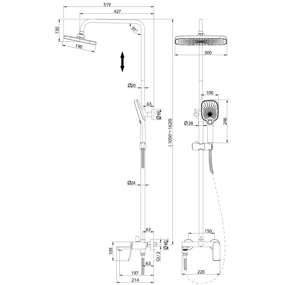 - Телескопическая душевая стойка позволяет изменять высоту до 165 см, что делает использование комфортным для людей разного роста.