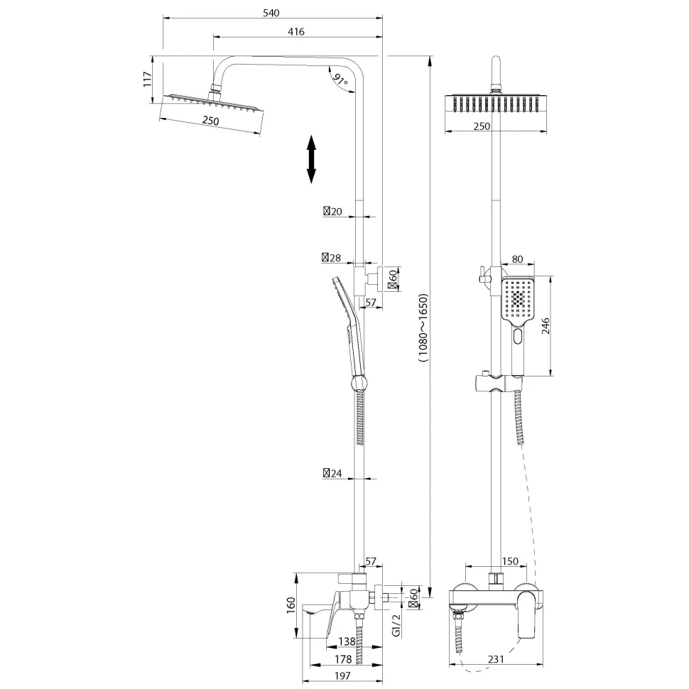 - Телескопическая душевая стойка позволяет изменять высоту до 165 см, что делает использование комфортным для людей разного роста.