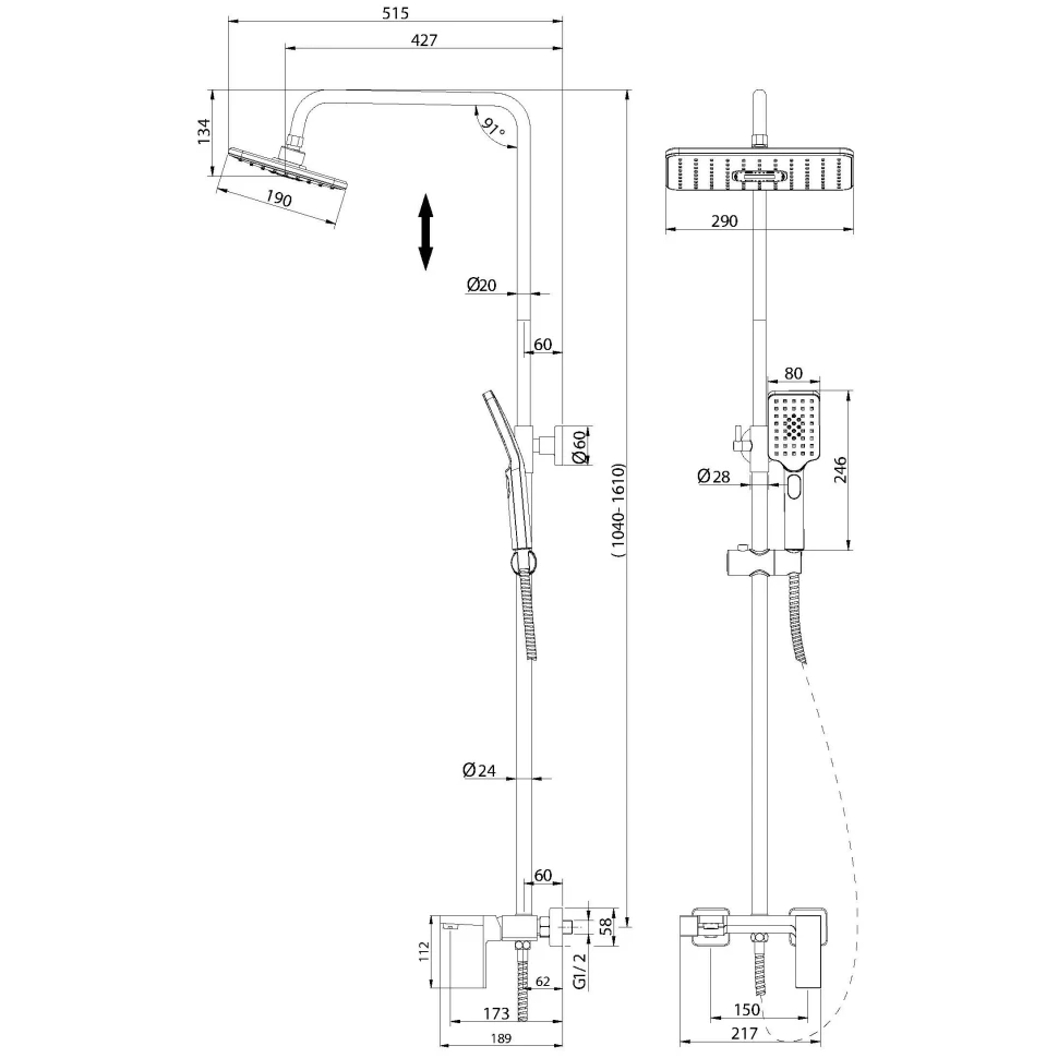 - Телескопическая душевая стойка позволяет изменять высоту до 165 см, что делает использование комфортным для людей разного роста.