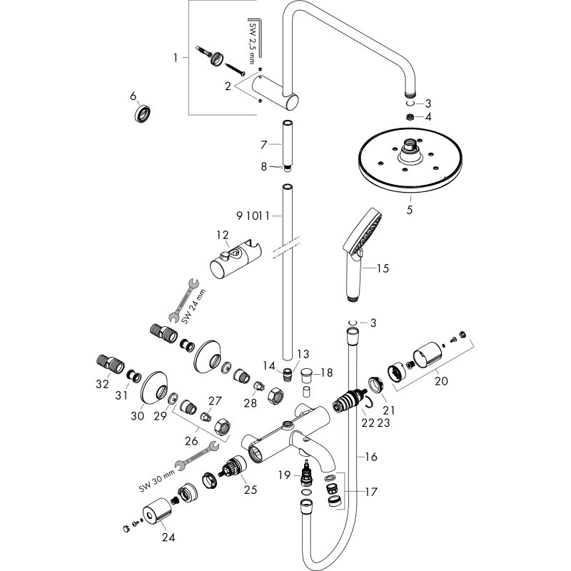 - Состоит из: верхний душ, ручной душ, термостат для ванны, штанга для душа, держатель для душа
