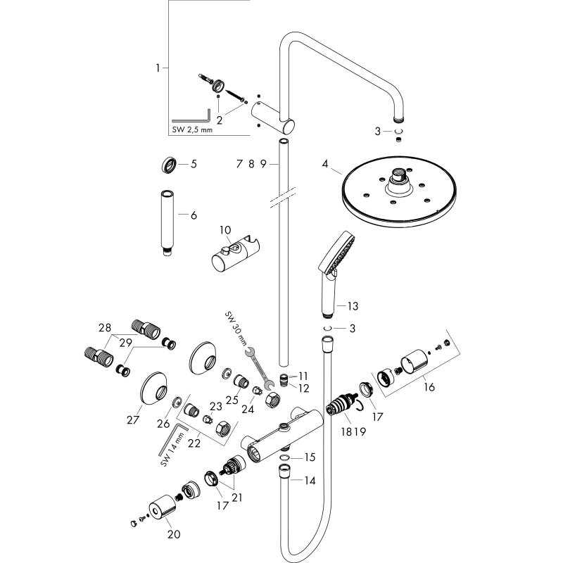 - Состоит из: верхний душ, ручной душ, термостат для душа, штанга для душа, душевая штанга, держатель для душа.