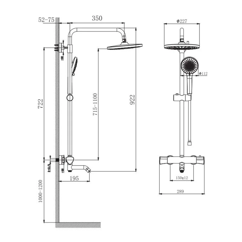 - Диаметр верхнего душа: 227 мм