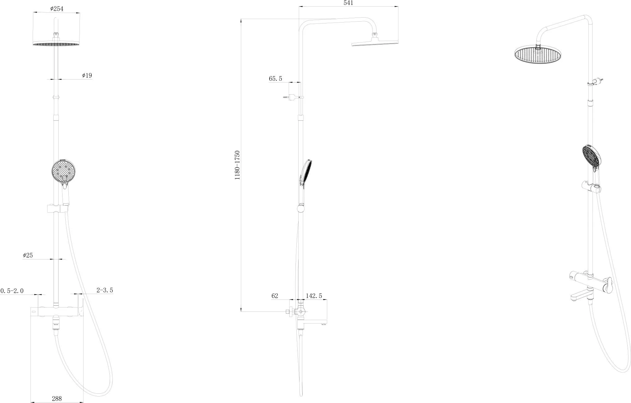 - Верхний душ и ручная лейка имеют форму круга. Стойка выполнена из нержавеющей стали, круглая в сечении. У ручной лейки предусмотрены четыре режима потока. Регулировка высоты при установке — 1180-1750 мм.