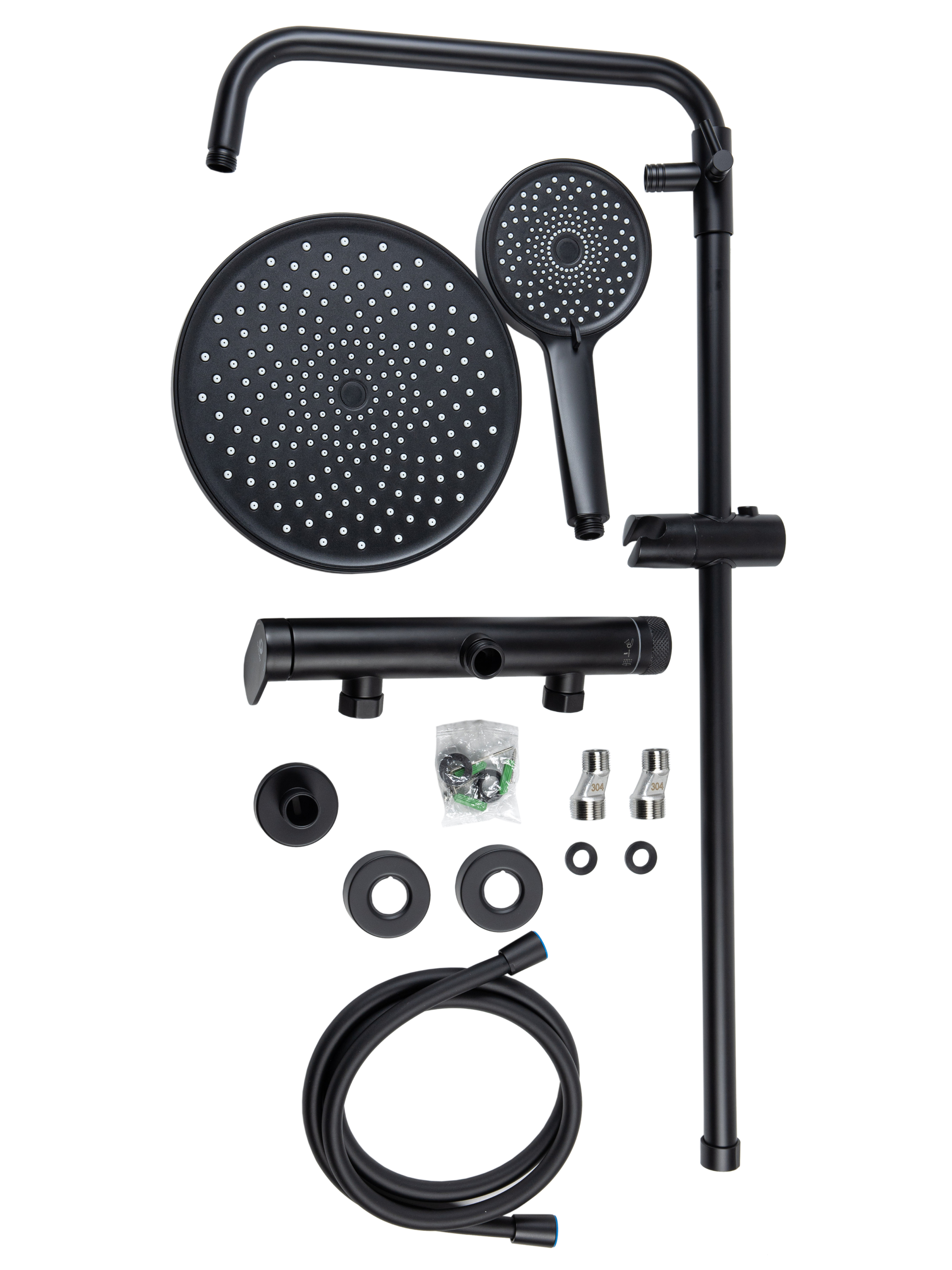 верхний душ, шланг для душа, смеситель, душевая лейка, душевая штанга, держатель лейки, держатель штанги, эксцентрики, отражатели, к-т креплений, инструкция
