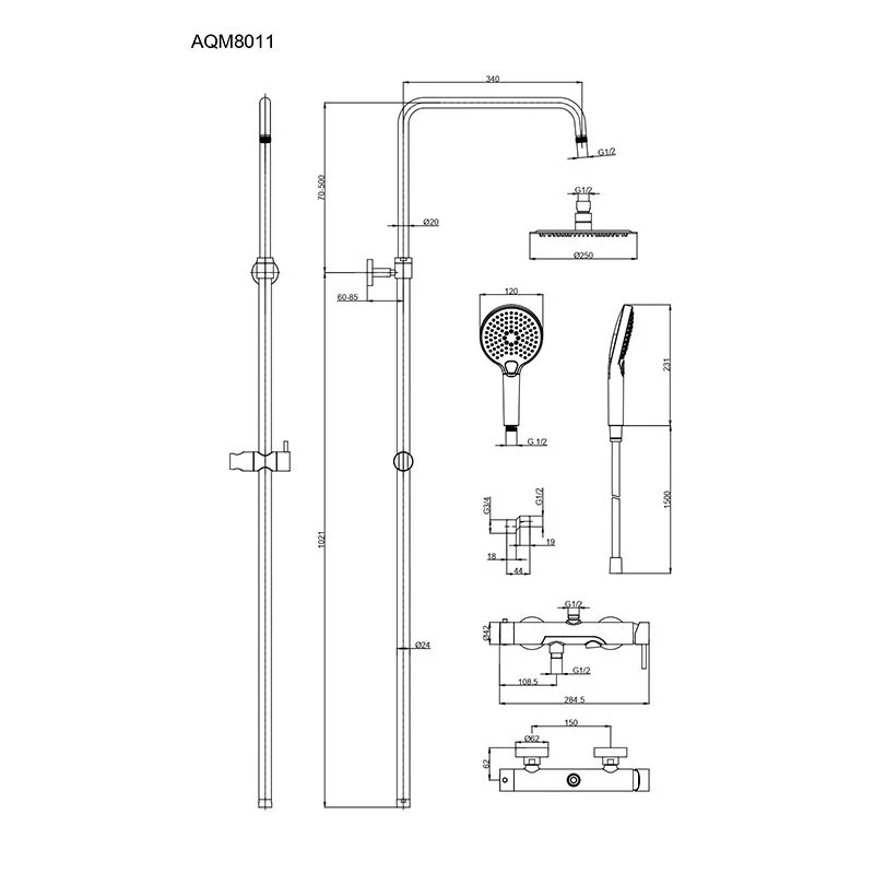 - Состоит из: верхний душ, ручной душ, излив, штанга для душа, держатель для душа.