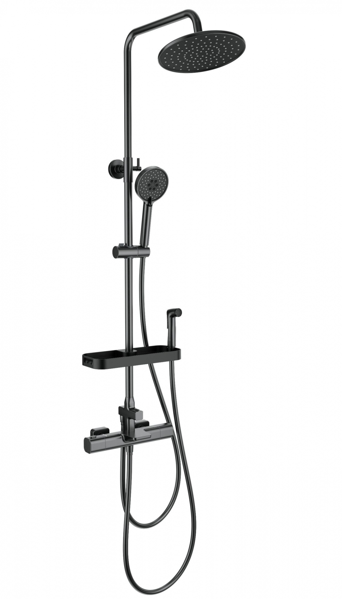Смеситель , Душевой шланг - 150 см , Душевой шланг - 120 см , Душевая штанга , Верхний душ , Душевая лейка , Лейка гигиенического душа , Полка , Эксцентрики , Монтажный комплект