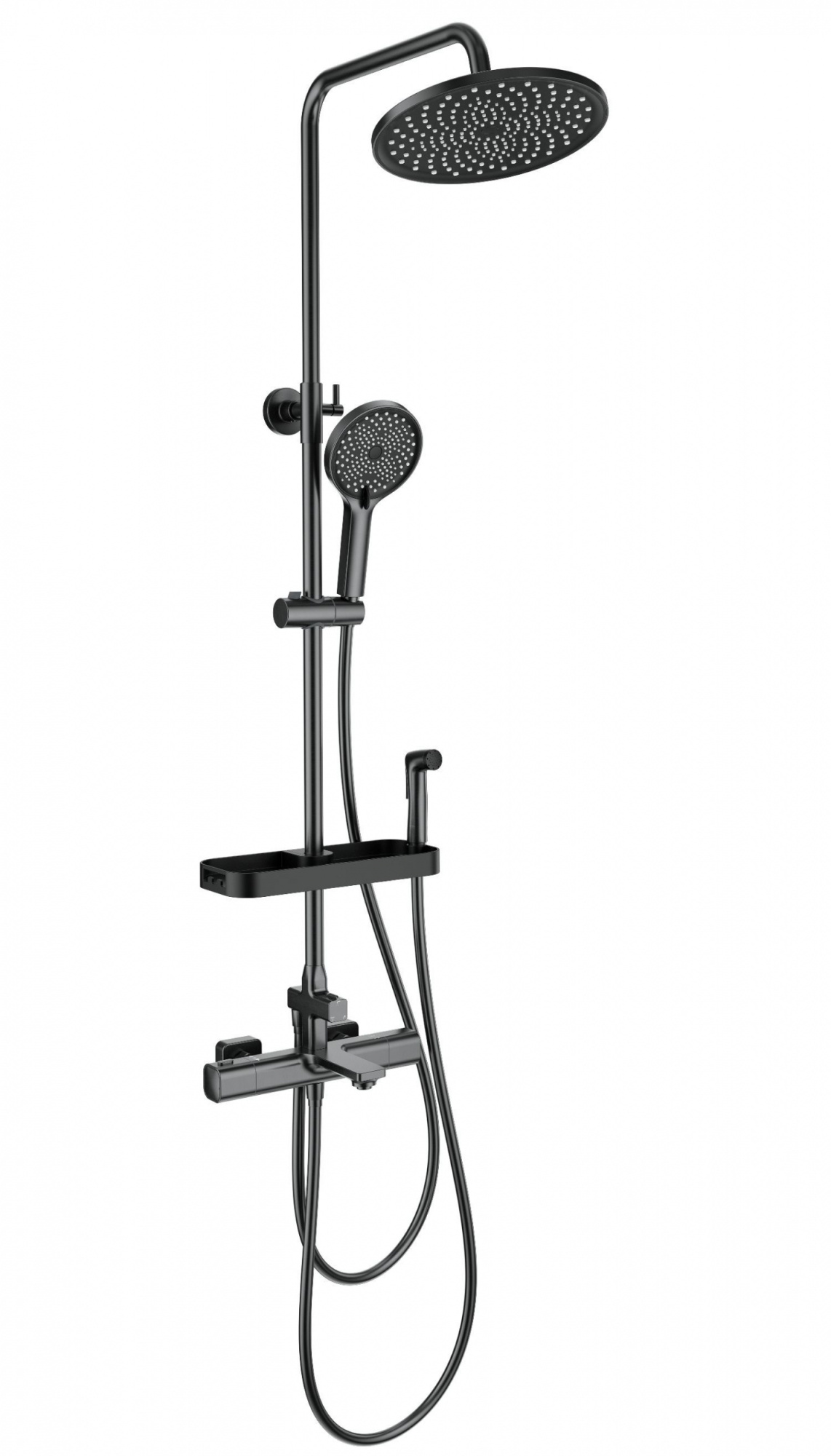 Смеситель , Душевой шланг - 150 см , Душевой шланг - 120 см , Держатель для душа , Душевая штанга , Верхний душ , Душевая лейка , Лейка гигиенического душа , Полка , Эксцентрики , Монтажный комплект