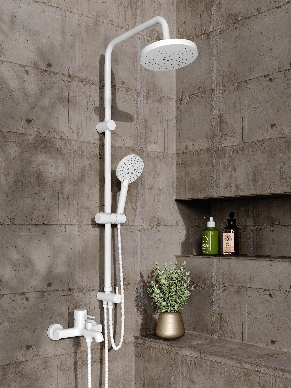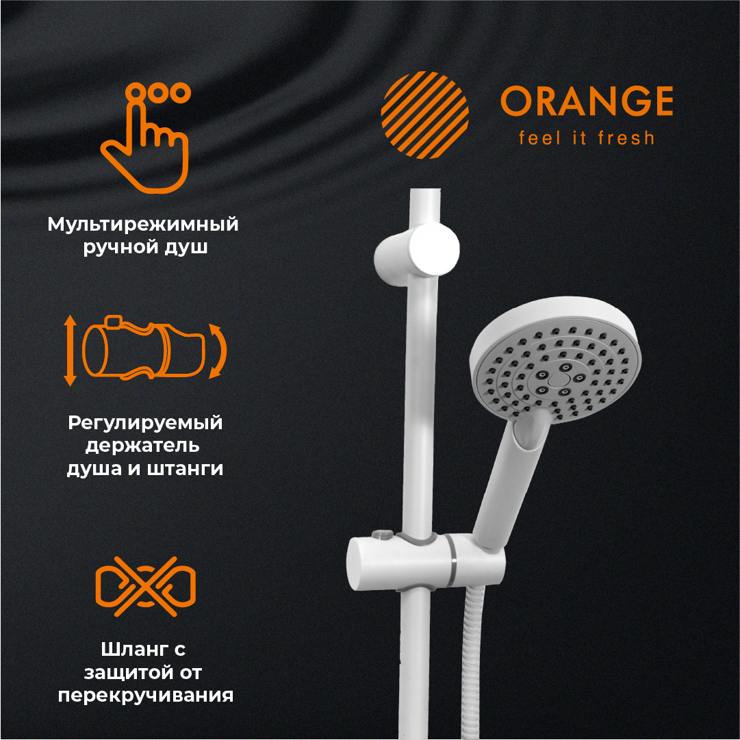 Душевая система Orange Karl со смесителем для ванны/душа в цвете белый глянец. Верхний душ (d200 мм - 2 режима) создаёт эффект тропического дождя, что дарит непередаваемые эмоции во время ежедневных процедур. Ручной душ 100 мм (3 режима) на гибком полутораметровом шланге (в металлической оплетке) с защитой от перекручивания. Держатели верхнего и ручного душа с регулировкой угла наклона. Штанга 970 мм с подвижным держателем (возможность установки в старые отверстия).