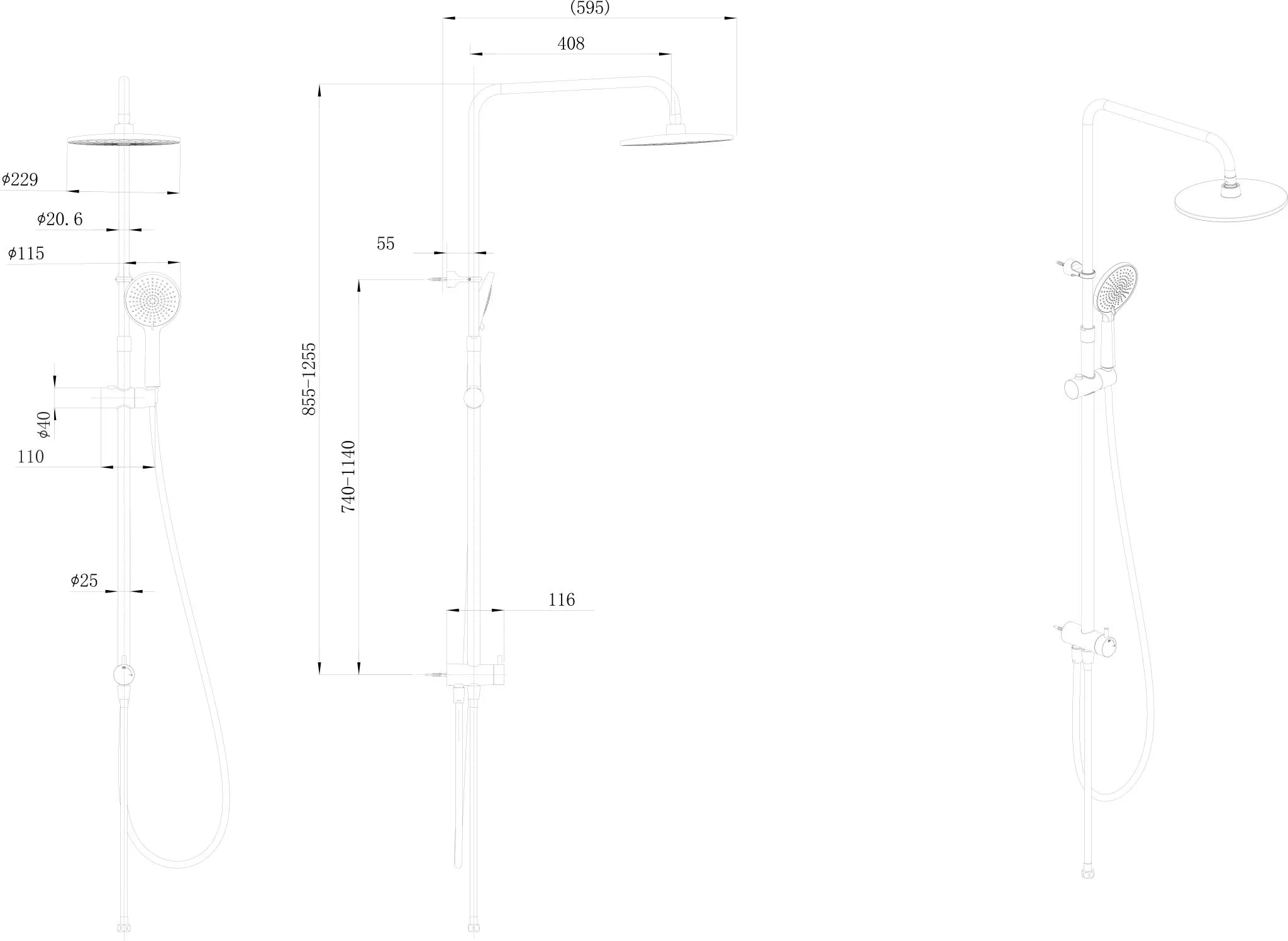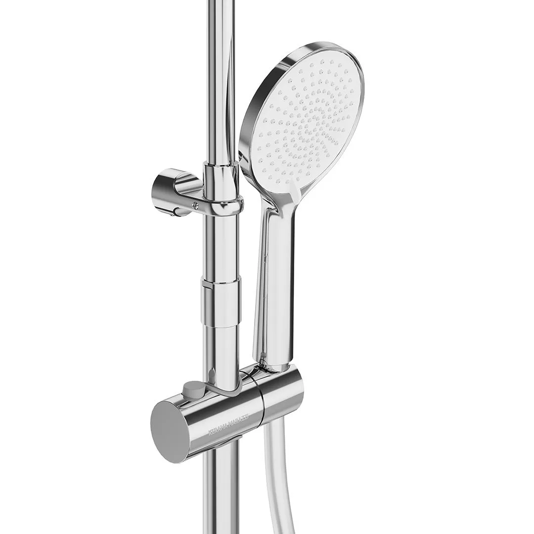 - Верхний душ и ручная лейка имеют круглую форму. Стойка выполнена из нержавеющей стали, круглая в сечении. У ручной лейки предусмотрены три режима потока. Регулировка высоты при установке — 855-1255 мм.