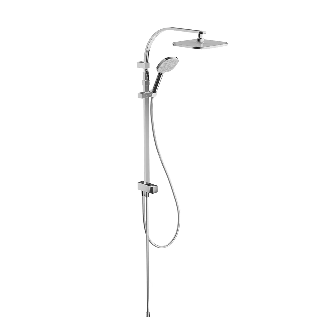 - Верхний душ и ручная лейка имеют форму квадрата со скруглёнными углами. Стойка выполнена из нержавеющей стали, круглая в сечении. У ручной лейки предусмотрены три режима потока. Регулировка высоты при установке — 930-1223 мм.