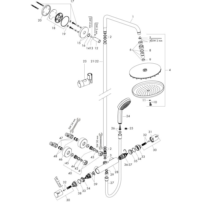 - Термостат с предохранителем на 40°C с запорным/переключающим вентилем на ручной и верхний душ.